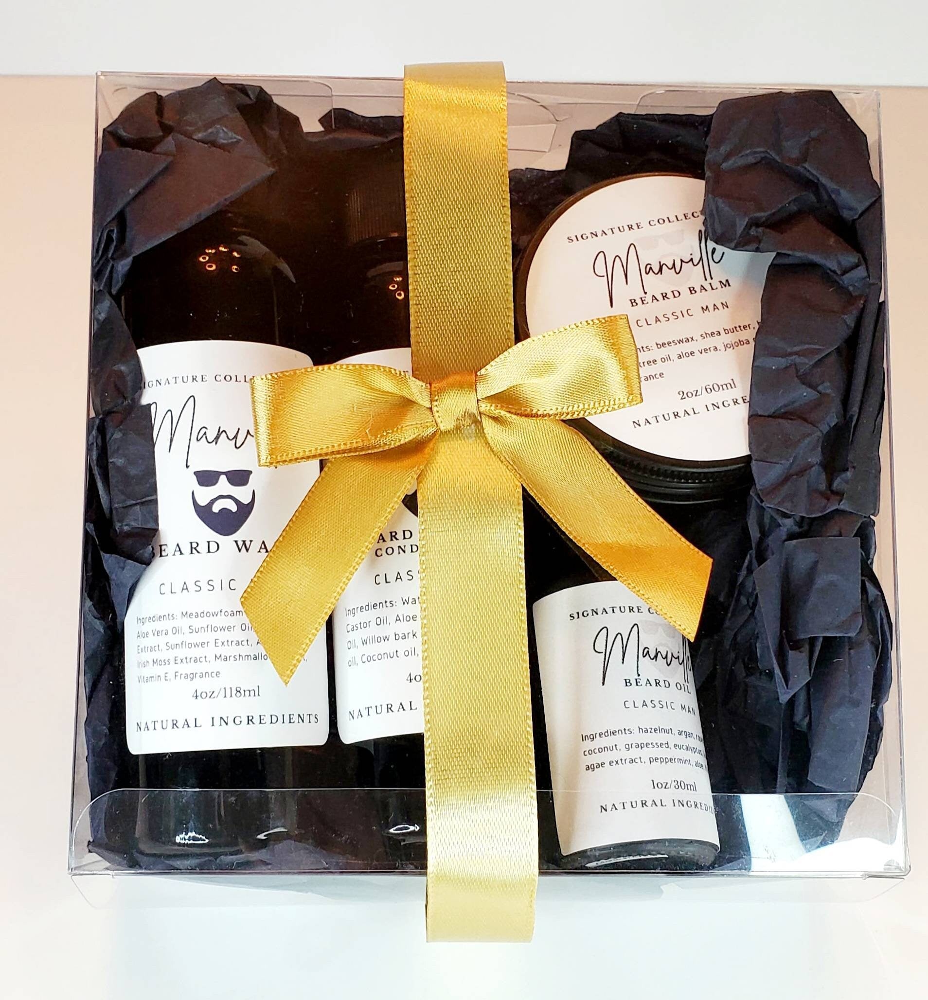 You will receive (1) 4oz Manville beard/hair wash & (1) Leave in conditioner (1) 1oz Beard/Face Oil (1) 2oz Shea butter Beard Balm/butter. These make a great gift for him.