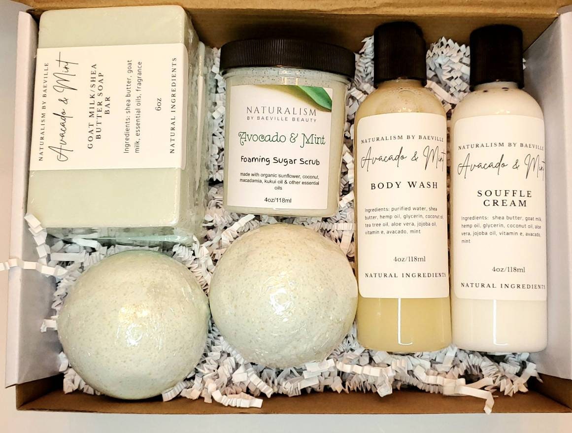 Gift set includes (1) 4oz foaming body scrub (1) 4oz shea butter body wash (1) 4oz shea butter/goat milk body cream (2) 5oz shea butter/goat milk soap bars (2) 5oz Bath Bombs (1) Coconut Infused Exfoliating Scrub Pad w (1) soap saver. Comes in gift box size 9x6x4inches. with personalized note.